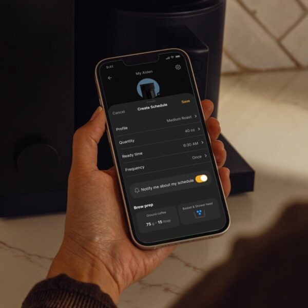 App: (iOs and Android): Stay connected with the Aiden app to keep your machine up to date and brewing at its best. Schedule brews, get notifications, create, share, and edit brew profiles, and automatically sync Fellow Drops brew profiles—all from your phone.
