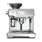 The Gaggia Velasca Prestige is a super-automatic espresso machine with customizable drink options, one-touch milk beverages, and stylish stainless steel paneling that blends modern and retro Italian design.